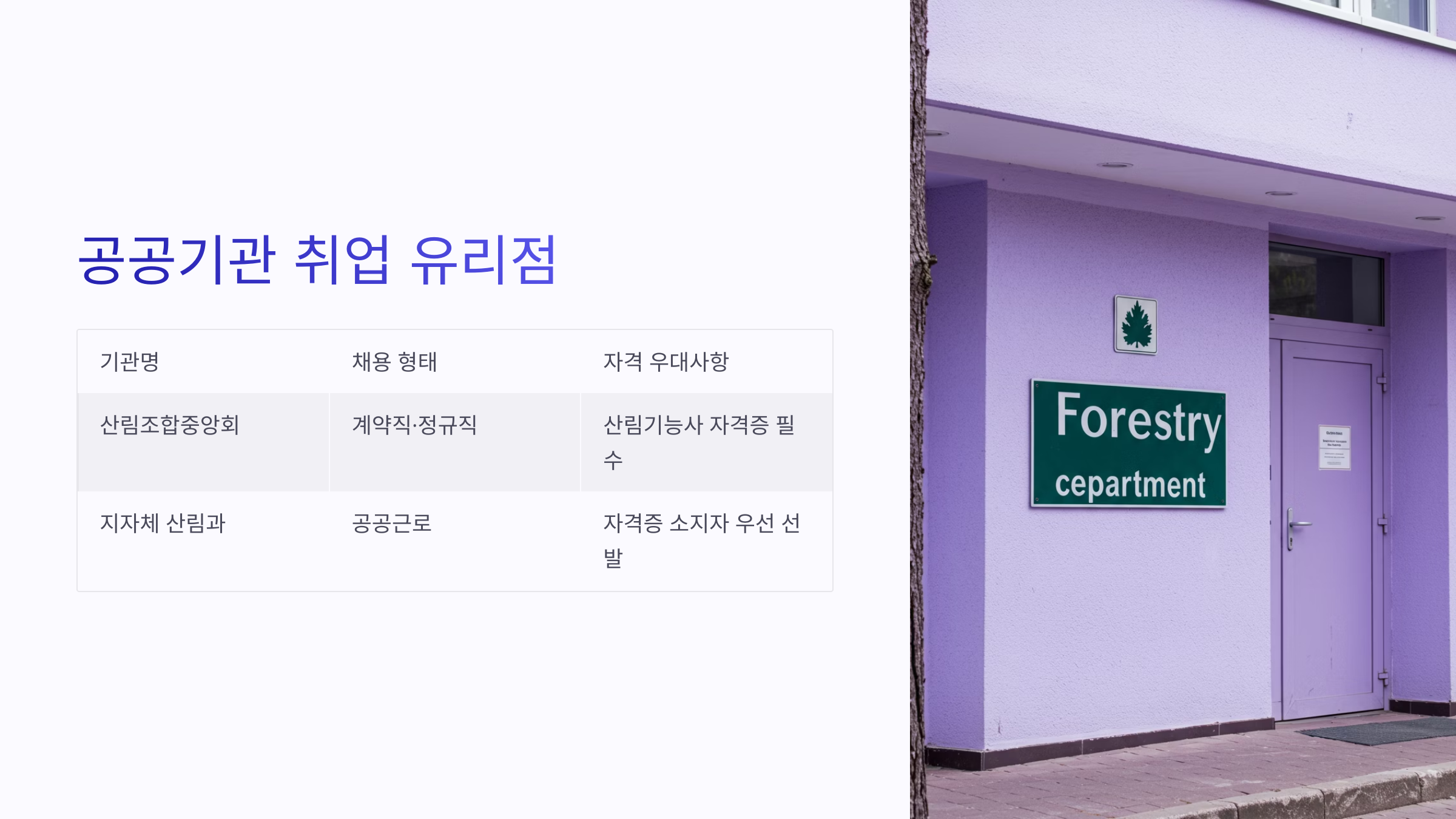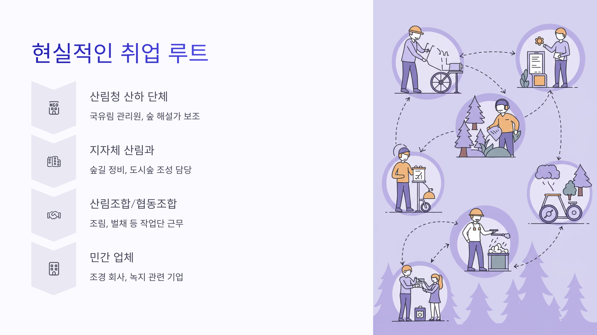 산림기능사 자격증을 따고 나면 어디에 취업할 수 있을까? 이건 진짜 중요한 문제예요. 현실적인 경로로는 다음과 같은 곳들이 있습니다: