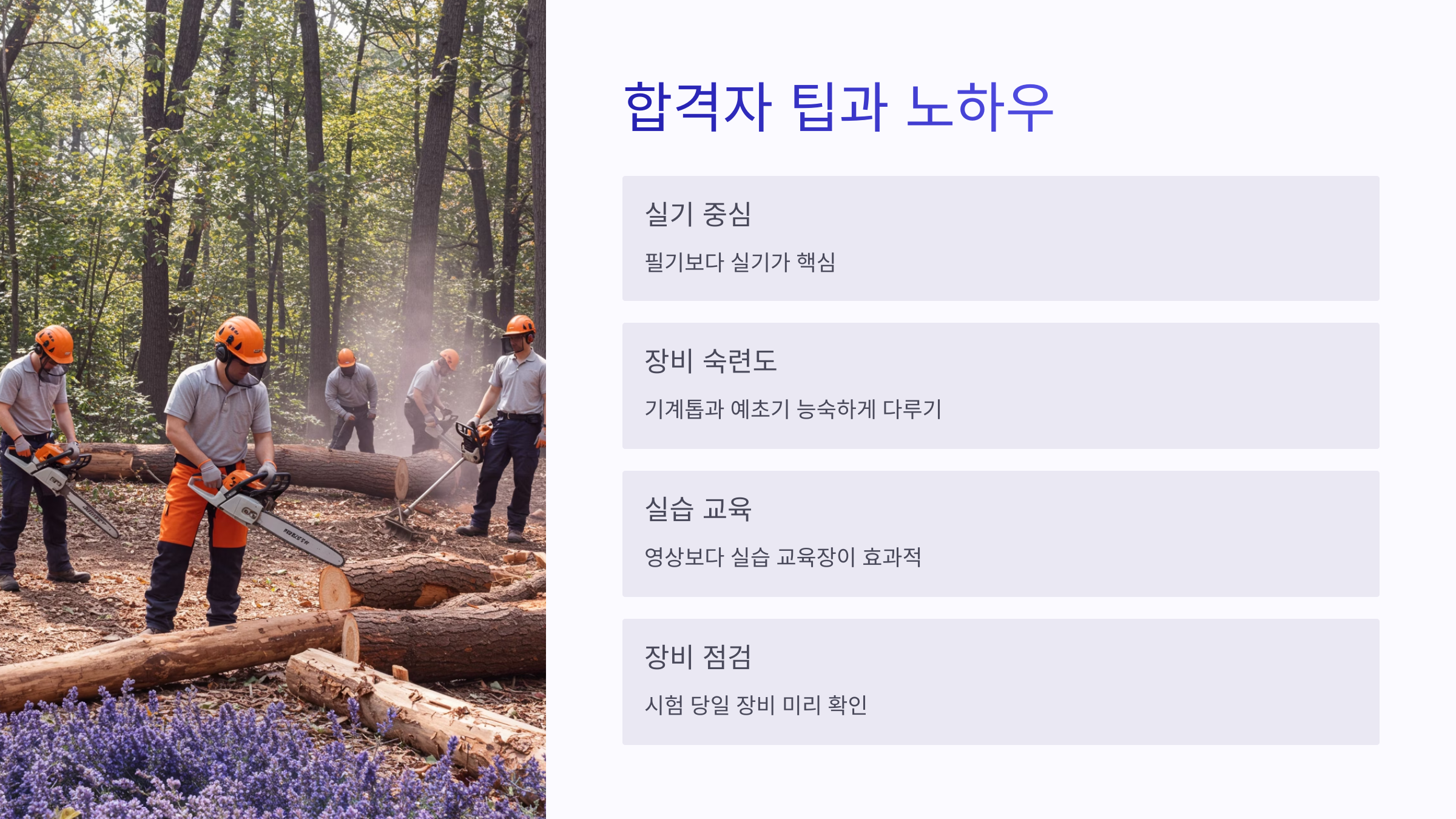 - 필기보다 실기가 핵심! 기계톱과 예초기 숙련도가 중요